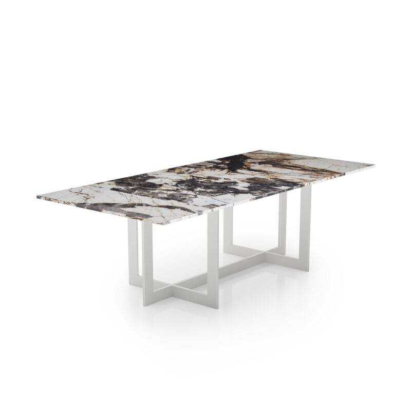 Blat stołu wykonany jest z naturalnego kamienia importowanego z Włoch, co nadaje mu wytrzymałość i elegancki wygląd.